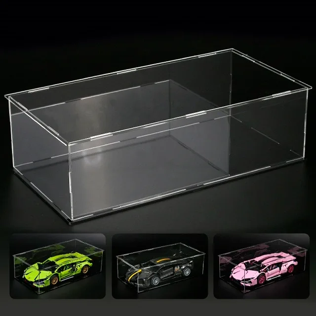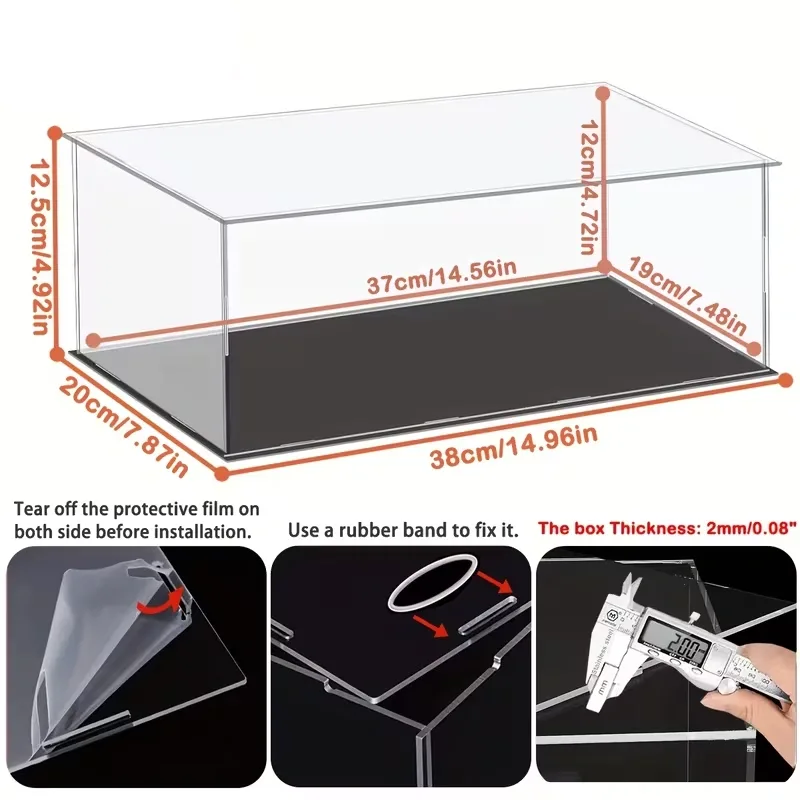 Внутрішні розміри боксу - 365х185х100мм (ширина, довжина, висота). Товар поставляється в розібраному вигляді (6 частин). Акрил з двох сторін покритий захисними плівками, які потрібно зняти перед збиранням. Для стійкості конструкції рекомендується зклеїти між собою бічні деталі та дно конструкції (верх залишається зйомним для доступу до моделей).